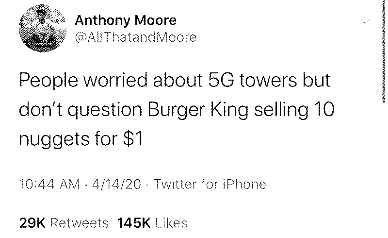 Bueno ¿De qué va esta ridícula hipótesis? Básicamente que apenas se encendieron las antenas de 5G se "activó" el virus que, obviamente para los conspiranoicos es artificial. Así es, no vaya a ser que las redes 5G no estan activas en la mayor parte del mundo ni que ya estaban activas FUERA del epicentro de Wuhan, nah, inventemos que fueron éstas las que "contagiaron".