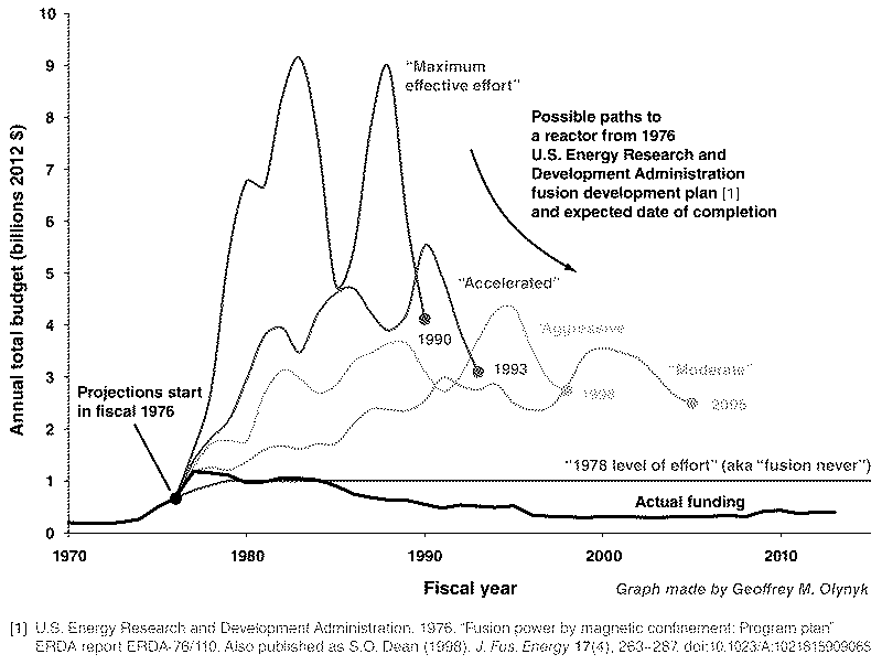 El gráfico que vemos pertenece a Geoffrey M. Olynyk , es de 2012 y resume cinco proyecciones presupuestarias realizadas en 1976 para la financiación de la investigación en fusión en EEUU.