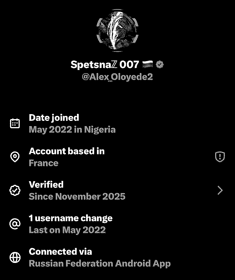 Este tiene todo, cuenta creada en Nigeria, pro Rusa, posteando desde Francia, pero publicando desde la app rusa de Twitter, genial.