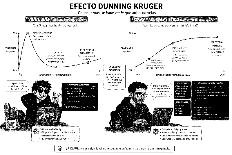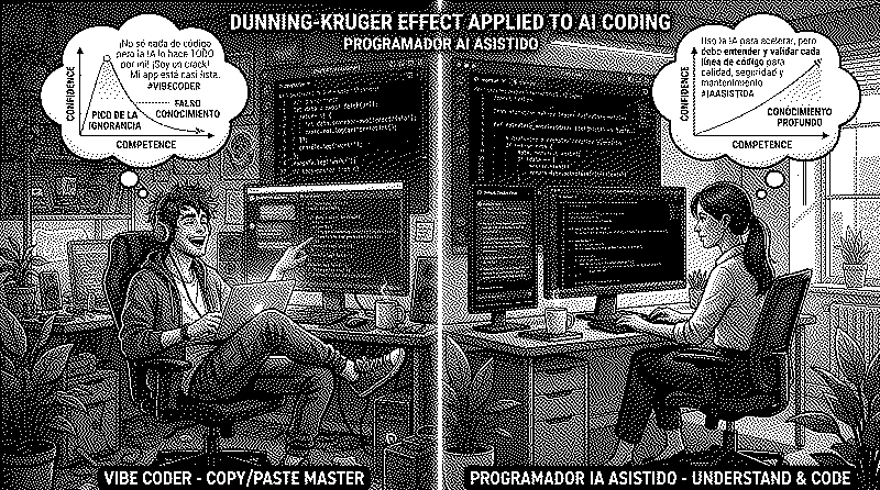 PS2: las imágenes del efecto Dunning-Kruger las generé con el prompt "representación visual del efecto dunning kruger entre un "vibe coder" que usa AI para programar sin saber absolutamente nada y un programador "AI Asistido" que usa AI para programar entendiendo el código. " las conclusiones las sacó el modelo automáticamente 😁